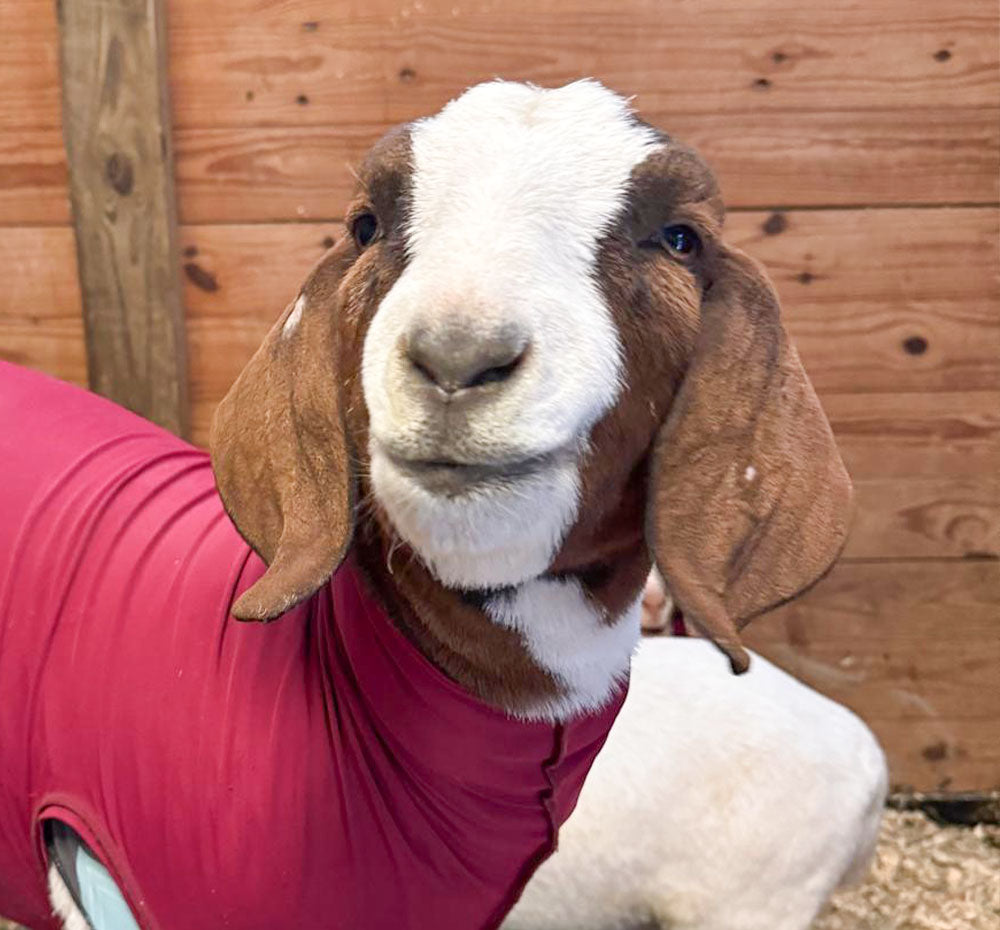 Finn is one of our five newest goat rescues! These sweet boys were part of a school program, but when the program ended, they faced an uncertain future—sold for slaughter or to a private buyer. Thanks to the compassion of the students and a kind-hearted buyer, they found their way to us for a second chance at life. Full of energy and joy, they’ve already made themselves at home, spending their days playing, exploring, and collapsing into adorable sleepy piles.
