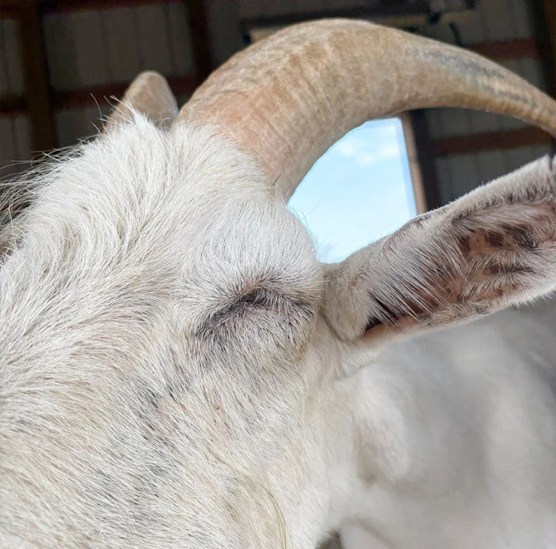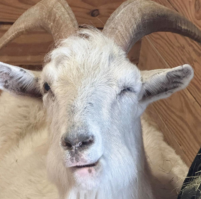 Lolly has a habit of tucking himself into a corner of a stall and spending hours knocking his horns against the walls. When the sun is out, you can find him basking on the hill, usually surrounded by other goats. He loves cuddles and will even fall asleep on you.