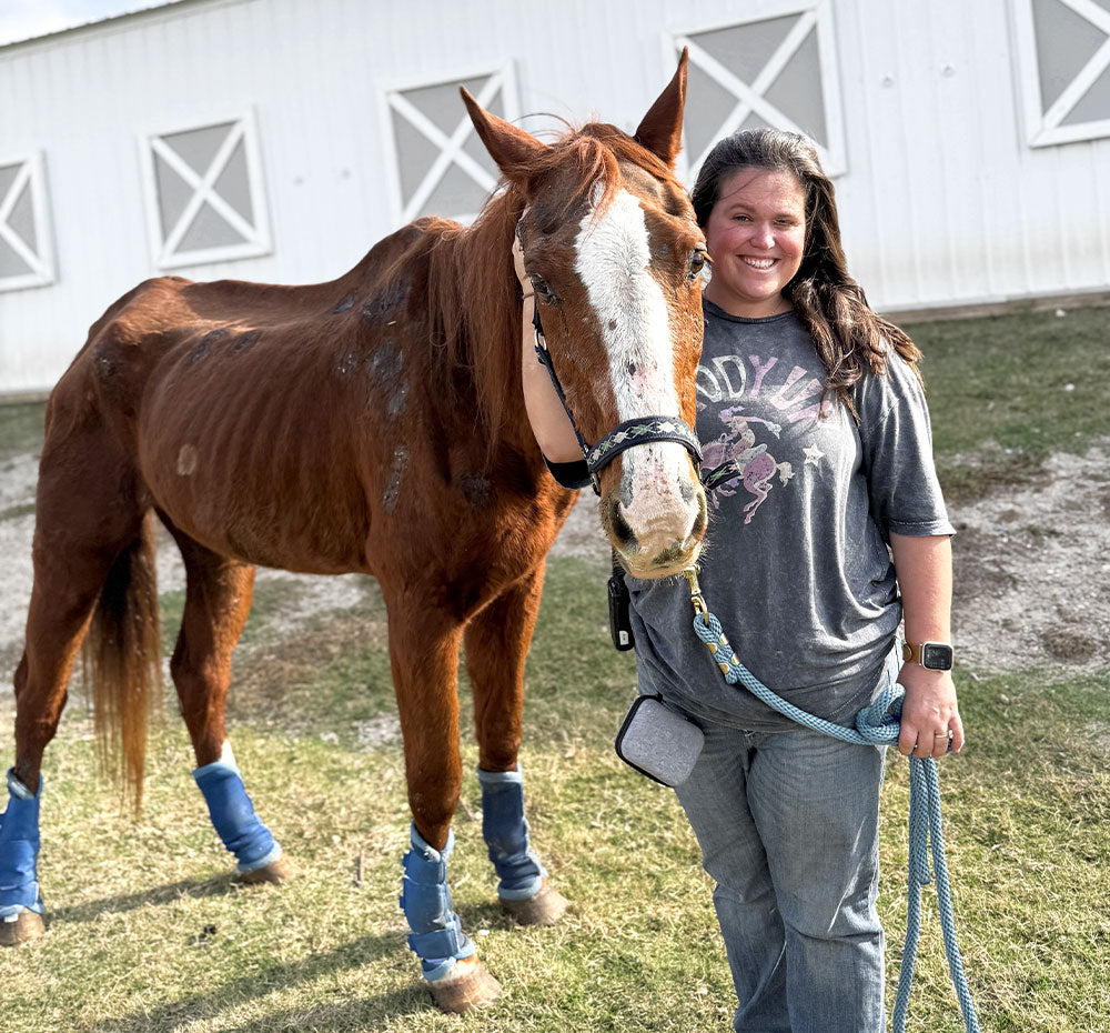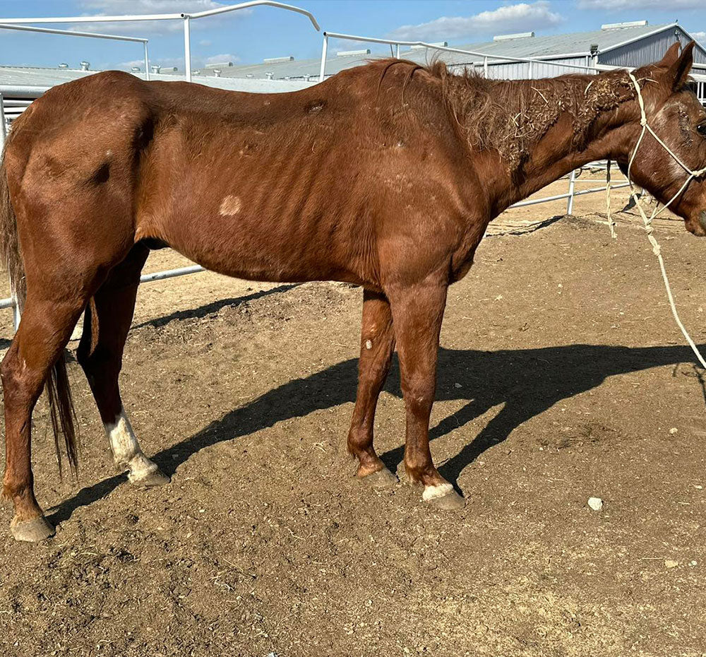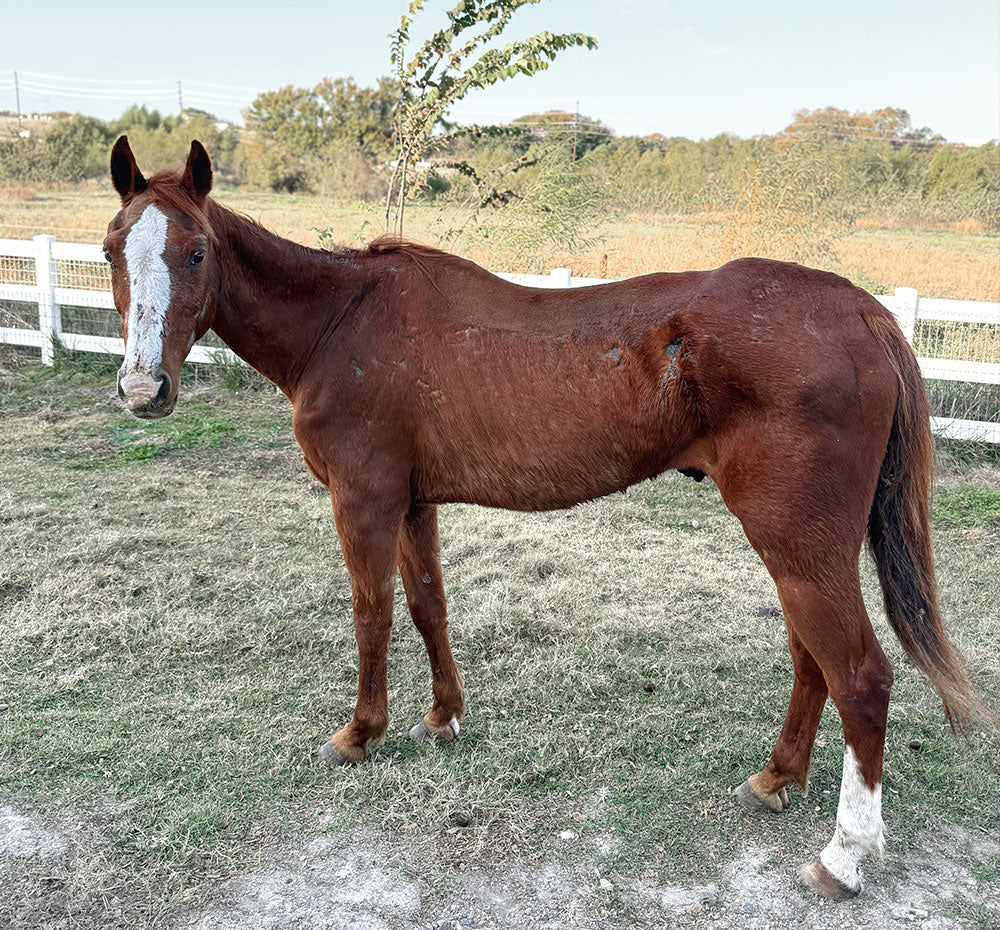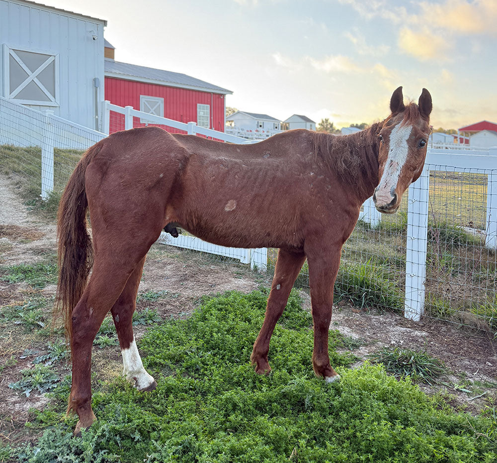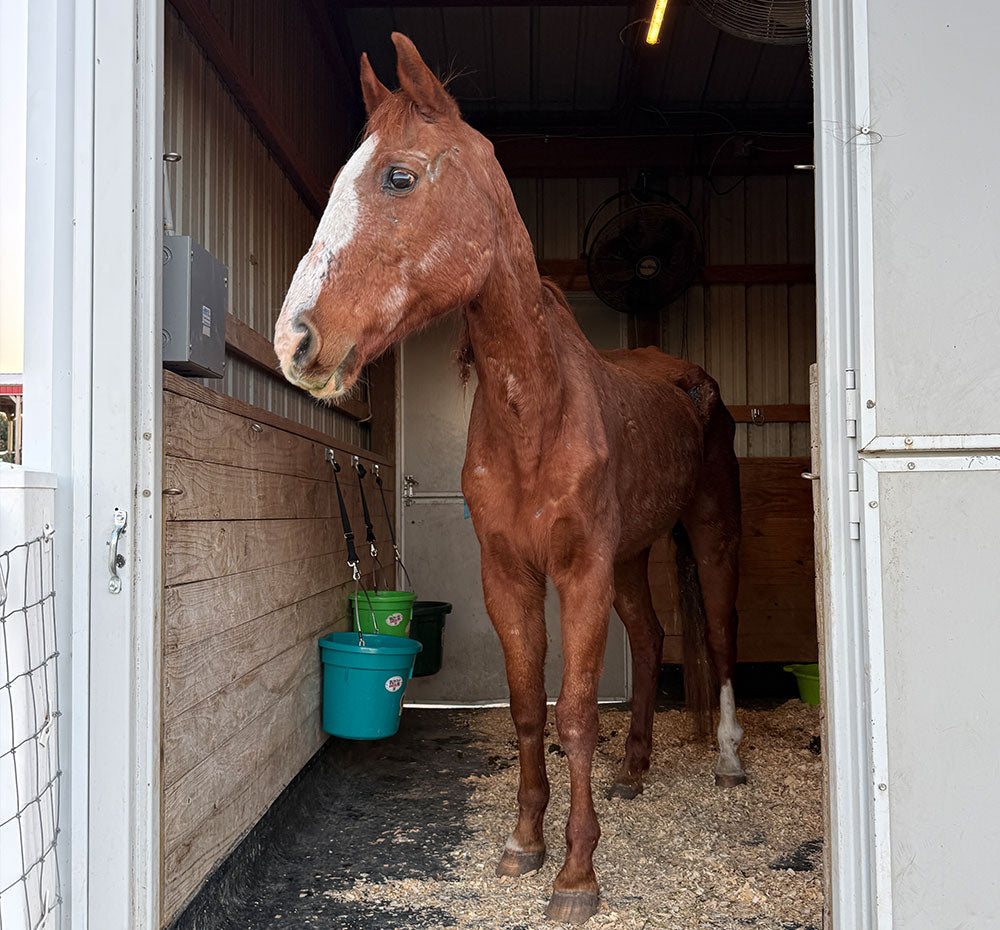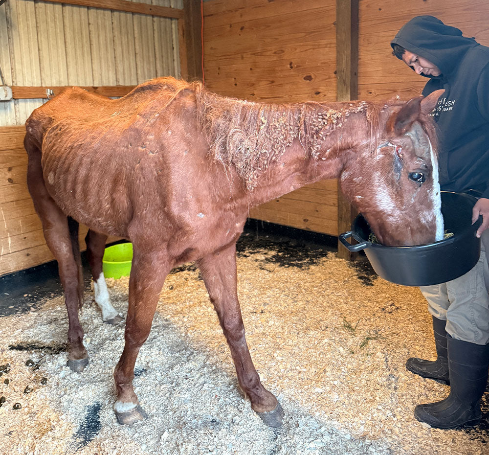 George arrived at the Sanctuary in the worst body condition we’ve ever seen—weighing only 650 pounds when he should be around 1,100. Thanks to lots of love, care, and big bowls of food, he’s been making incredible progress and steadily gaining weight. George is endlessly curious and loves standing in the doorway of his stall (purple blanket draped over his back!) watching all the activity around him.