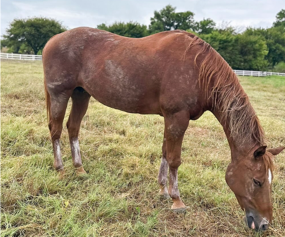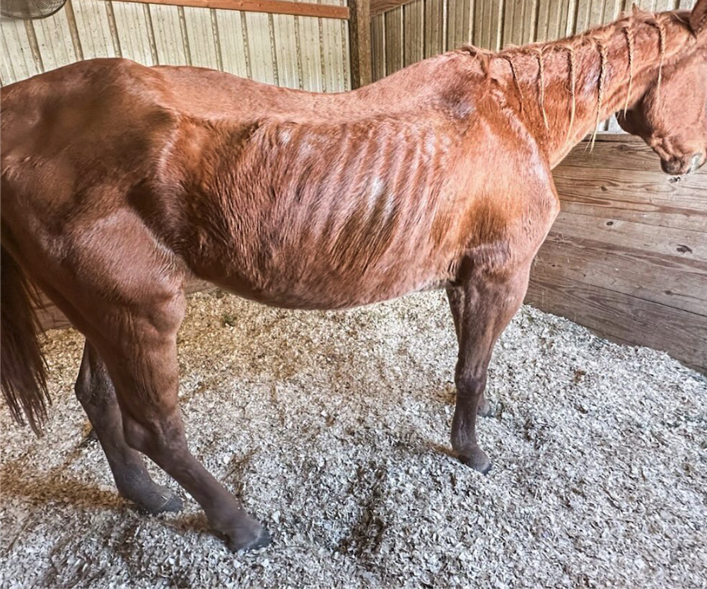 We found Izzy at a sale barn in a heartbreaking state – emaciated and graded at a mere 1 on the body scale. Her severely overgrown teeth likely kept her from eating properly for months. After spending a week in the hospital and overcoming pneumonia, she's back home with us on the Farm and taking each step toward recovery with newfound strength!