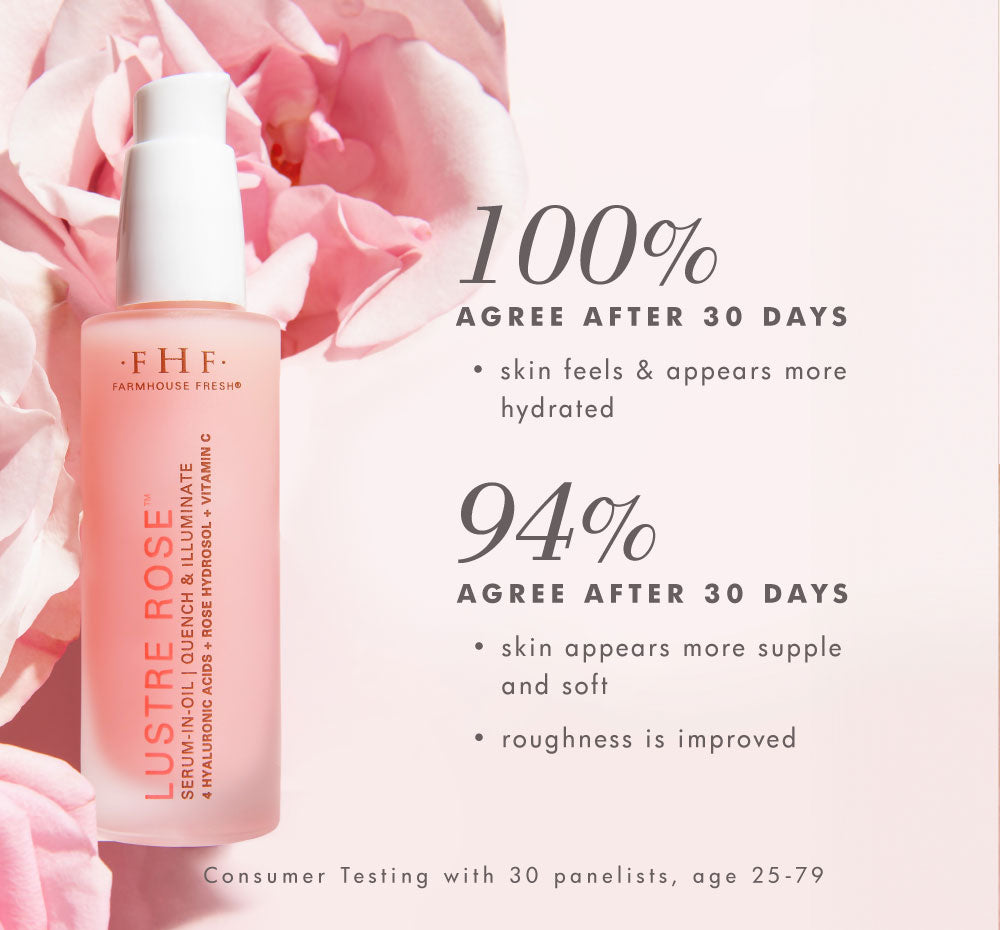 Why you'll love it: Lustre Rose® is wondrous. Its clinically tested, gentle, non-irritating formula is infused with vitamins C & E, 4 forms of Hyaluronic Acid that hydrate and give a bouncy look, plus seaberry oil flush with Omega 7 & 9 fatty acids. Organic rose hydrosol adds moisture and a bouquet of natural scent. You will love your new quenched complexion! Use alone, or under a daily moisturizer.
