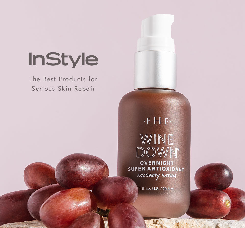 Nourishing results: Our FHF team puts Wine Down® at the top of our list of favorite products because so many of us are able to wear less makeup now. InStyle Magazine selected Wine Down® as one of the best products for serious skin repair.