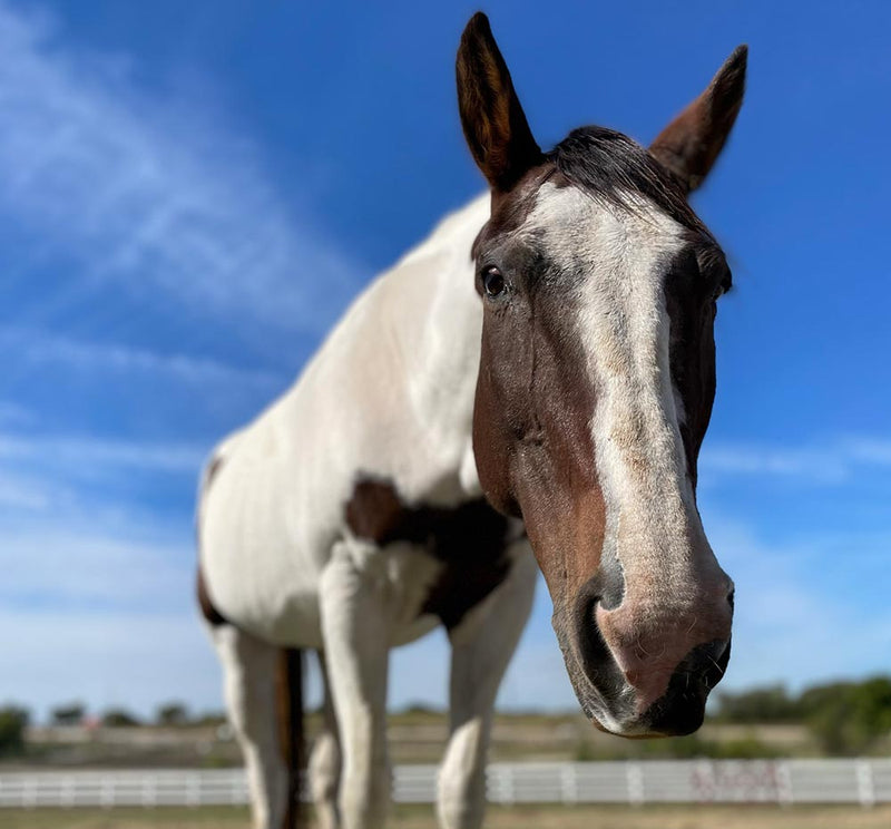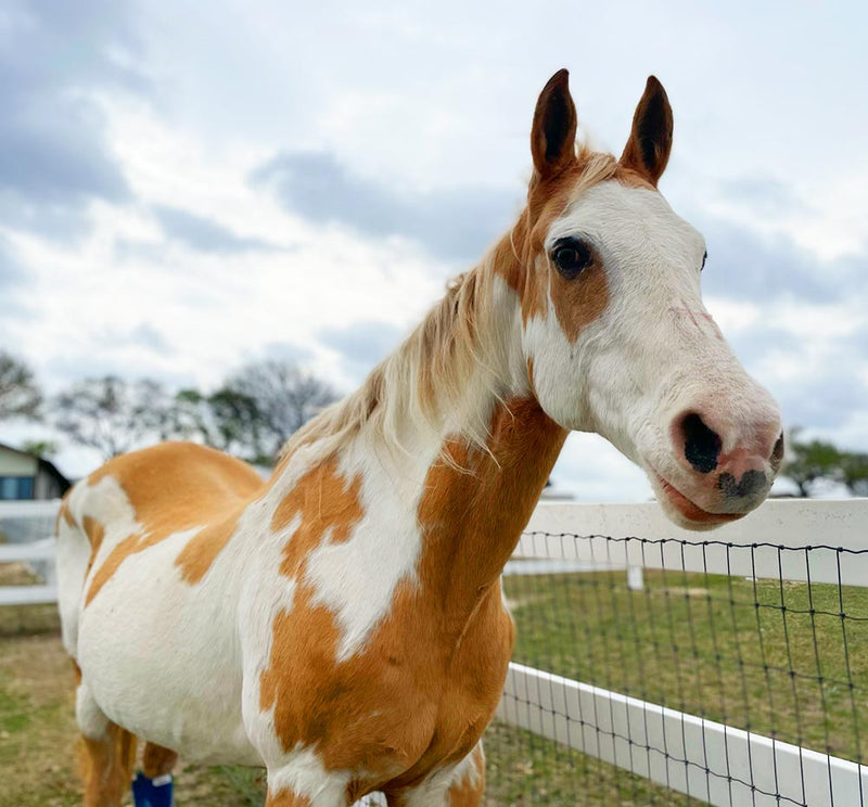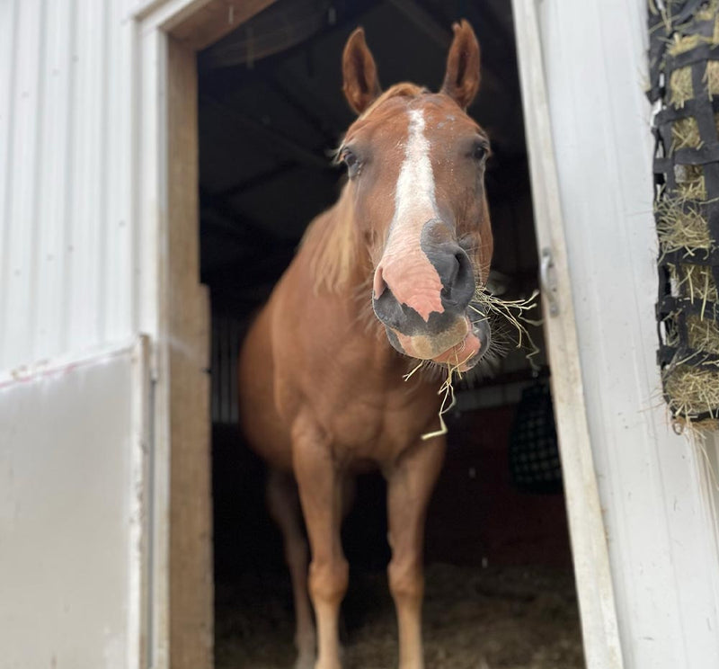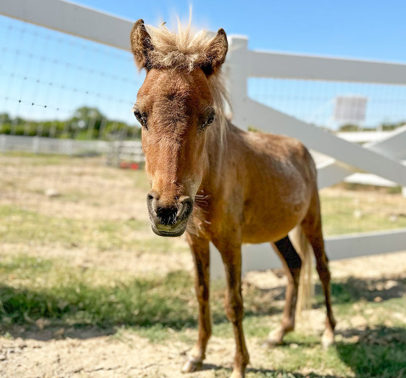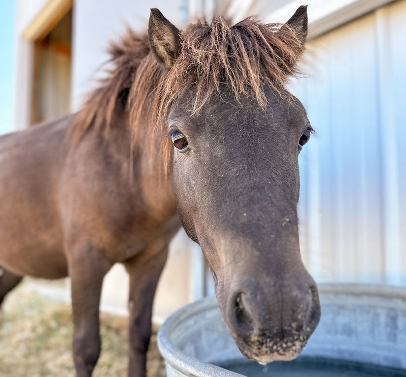 We found Izzy at a sale barn in a heartbreaking state – emaciated and graded at a mere 1 on the body scale. Her severely overgrown teeth likely kept her from eating properly for months. After spending a week in the hospital and overcoming pneumonia, she's back home with us on the Farm and taking each step toward recovery with newfound strength!